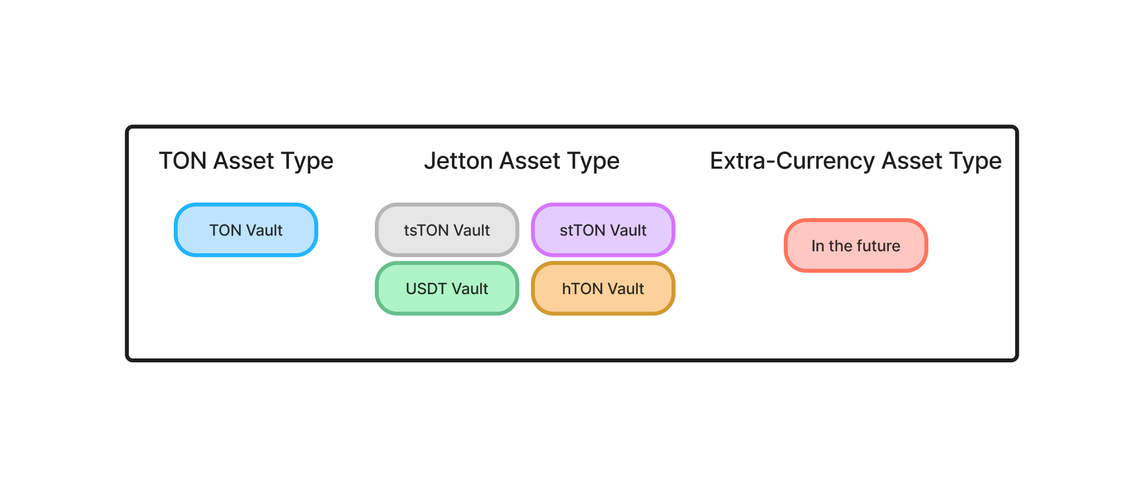 Jetton represents another asset type managed by Jetton Vaults. Each Jetton has its own dedicated Vault, such as USDT Vault or tsTON Vault.